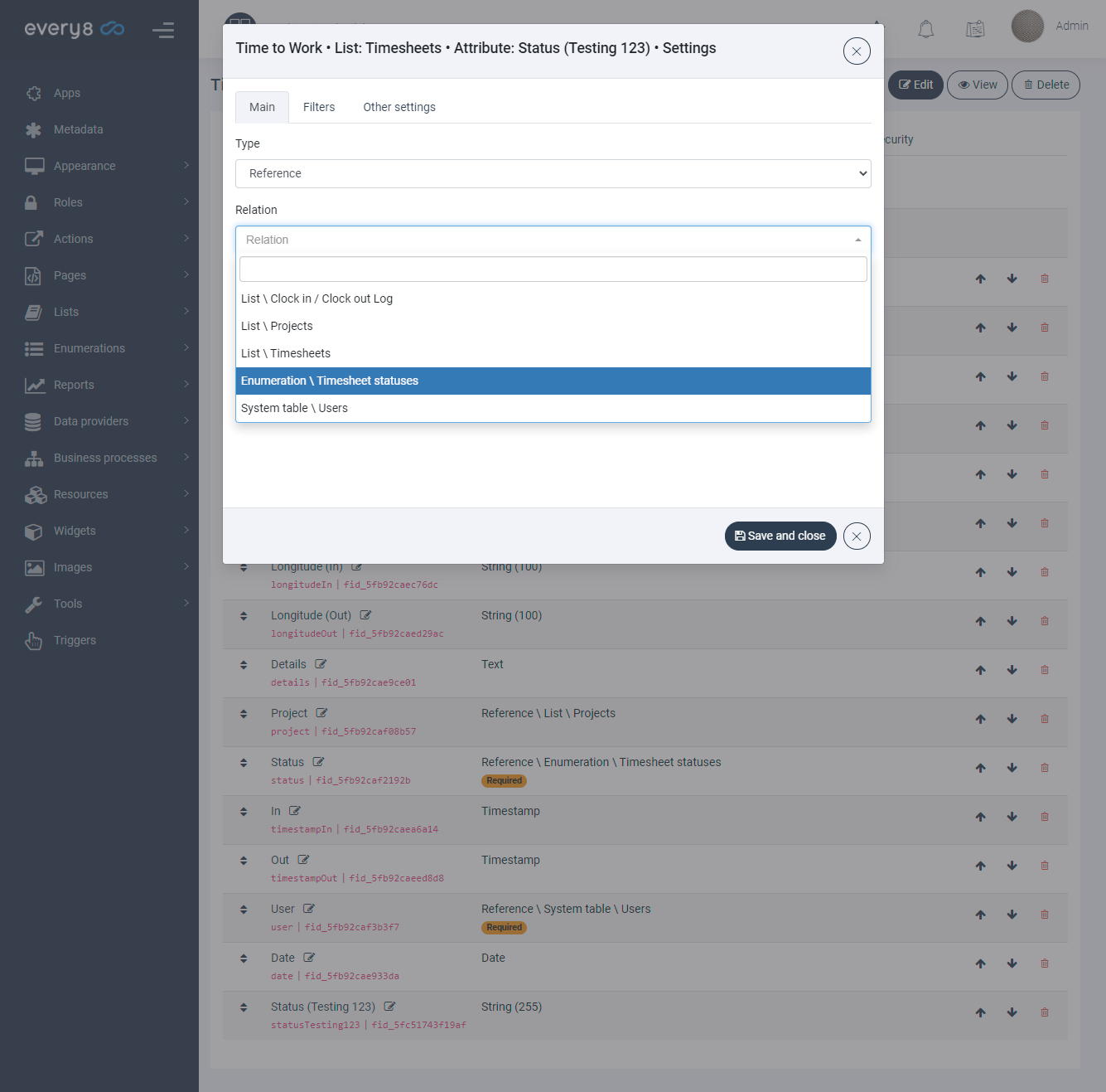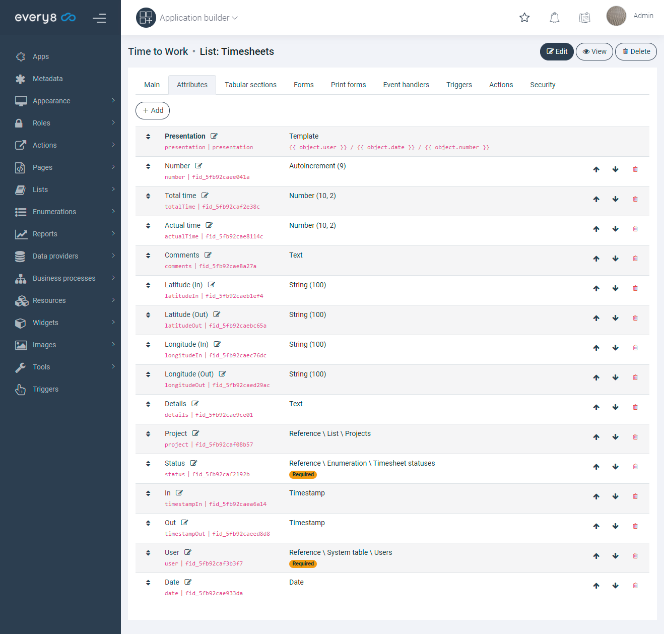 All of these things can be added in Time to Work (app builder view) -> Lists -> create a list called “Timesheets” -> Attributes tab -> add each of the above bullet points as an attribute.