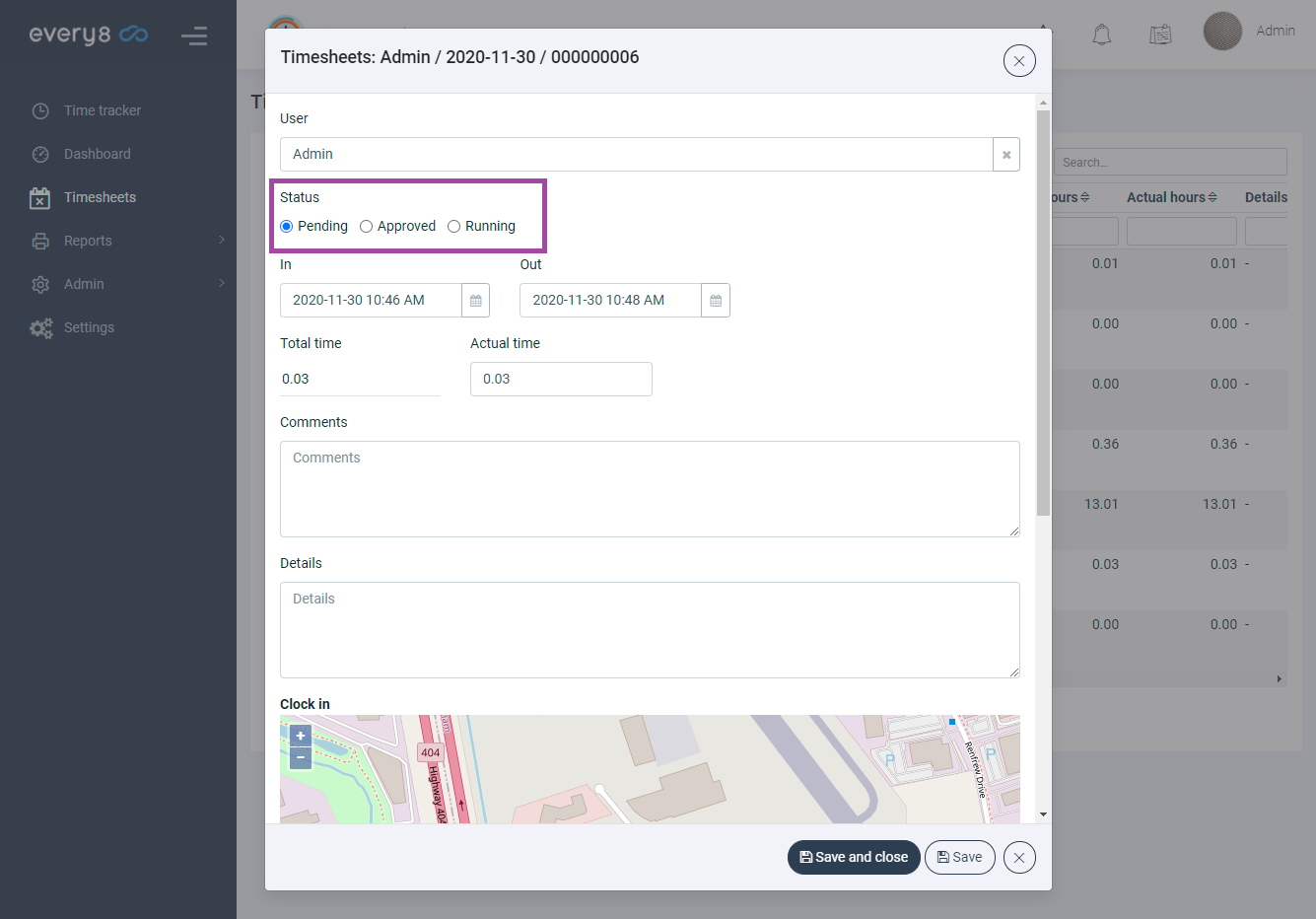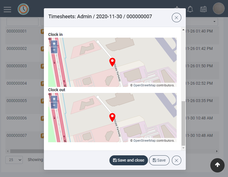 Later on, the employee’s location at both times (clocking in and out) will show up on their timesheet: